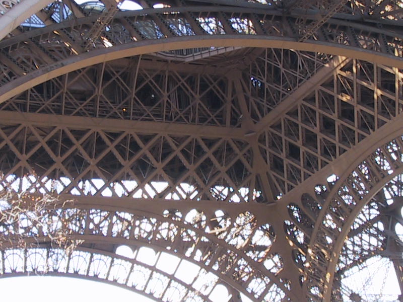 Gros plan des poutrelles des piliers et du premier étage de la Tour Eiffel à Paris