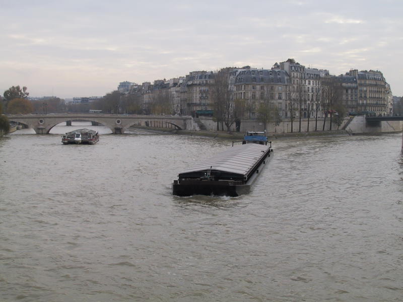 avec passage d'une péniche et d'un bateau mouche de chaque côté de l'Ile Saint-Louis.