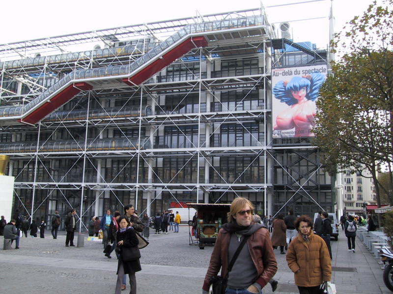 Photo de la façade du centre Beaubourg et la place Georges Pompidou depuis la rue Saint-Merri à Paris